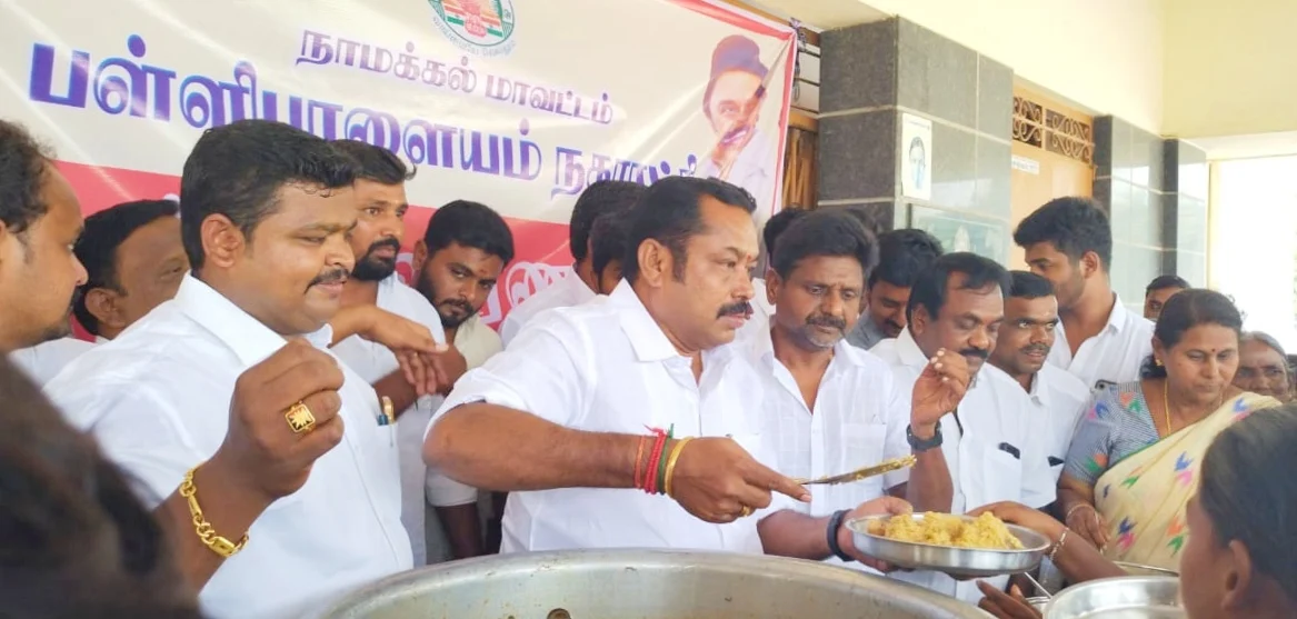 மாண்புமிகு தமிழக முதலமைச்சர் உயர்திரு மு.க.ஸ்டாலின் அவர்களின் ஆணைக்கிணங்க, மாநில இளைஞரணி செயலாளர் மாண்புமிகு உதயநிதி ஸ்டாலின் அவர்களின் அறிவுறுத்தலின்படி இன்று மதியம் 12 மணி அளவில் நாமக்கல் மேற்கு மாவட்ட செயலாளர் உயர்திரு S.M.மதுரா செந்தில் அவர்கள் பள்ளிபாளையத்தில் வெள்ளத்தால் பாதிக்கப்பட்டு முகாம்களில் தங்க வைக்கப்பட்டுள்ள மக்களை நேரில் சந்தித்து குறைகளை கேட்டறிந்தார். மேலும் முகாம்களில் தங்க வைக்கப்பட்டுள்ள மக்களுக்கு மதியம் அசைவ உணவு வழங்கினார். இந்த நிகழ்வில் நகர மன்ற தலைவர் மோ.செல்வராஜ், மாவட்ட பிரதிநிதி ப.பாலமுருகன், நகர மன்ற